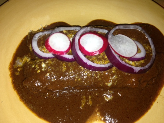 Next up was Pancita, a spicy tripe soup served with handmade tortillas, chopped onions and lime. Also known as a great hangover cure, this soup really perks you up. Following that we enjoyed Enchiladas al Maguey, which was comprised of homemade corn tortillas filled with chicken and rolled in their specialty mole poblano sauce. This dish was delicious and the sauce was incredible.