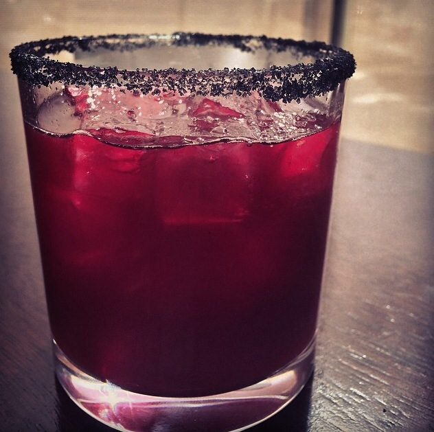 Shake and strain over fresh regular ice in a rocks glass. Garnish with black salt ½ rim.
