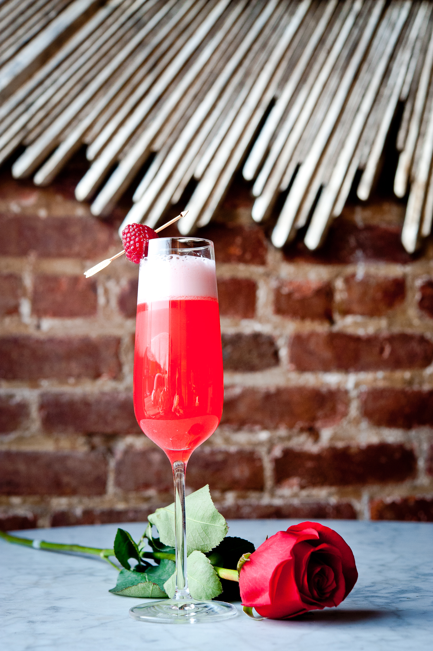 Shake all ingredients and strain in to champagne flute – top with champagne float, skewered raspberry and lemon peel twist.