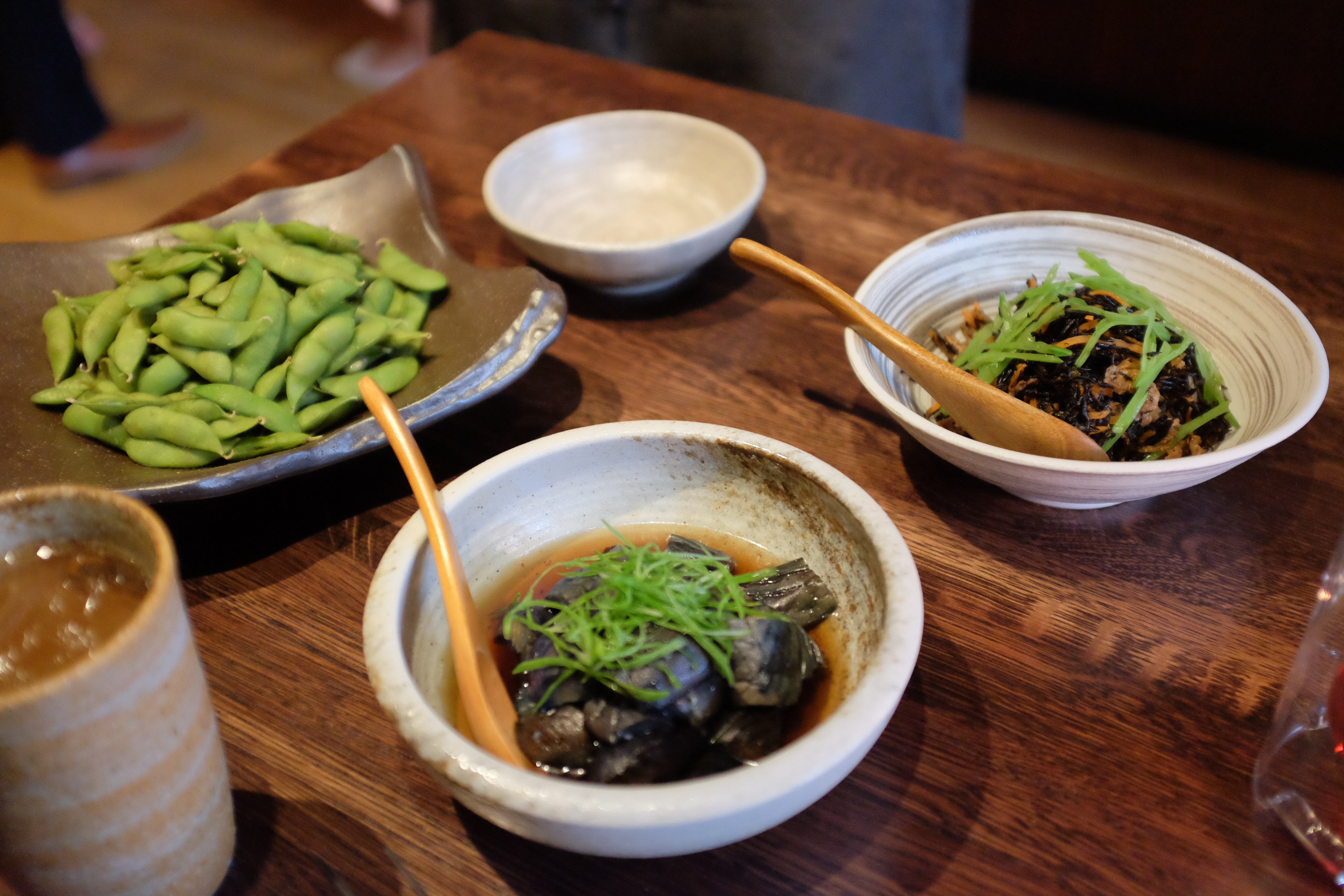 The feast began with an array of appetizing cold dishes. Highlights included a Japanese eggplant in soba broth, Washugyu Tataki, thinly sliced beef with a Yuzu Kosho sauce, and the Maguro Tartar, with Bluefin tuna, wasabi, pine nuts and a quail egg, served with buckwheat chips. A side dish of edamame was stellar, too.