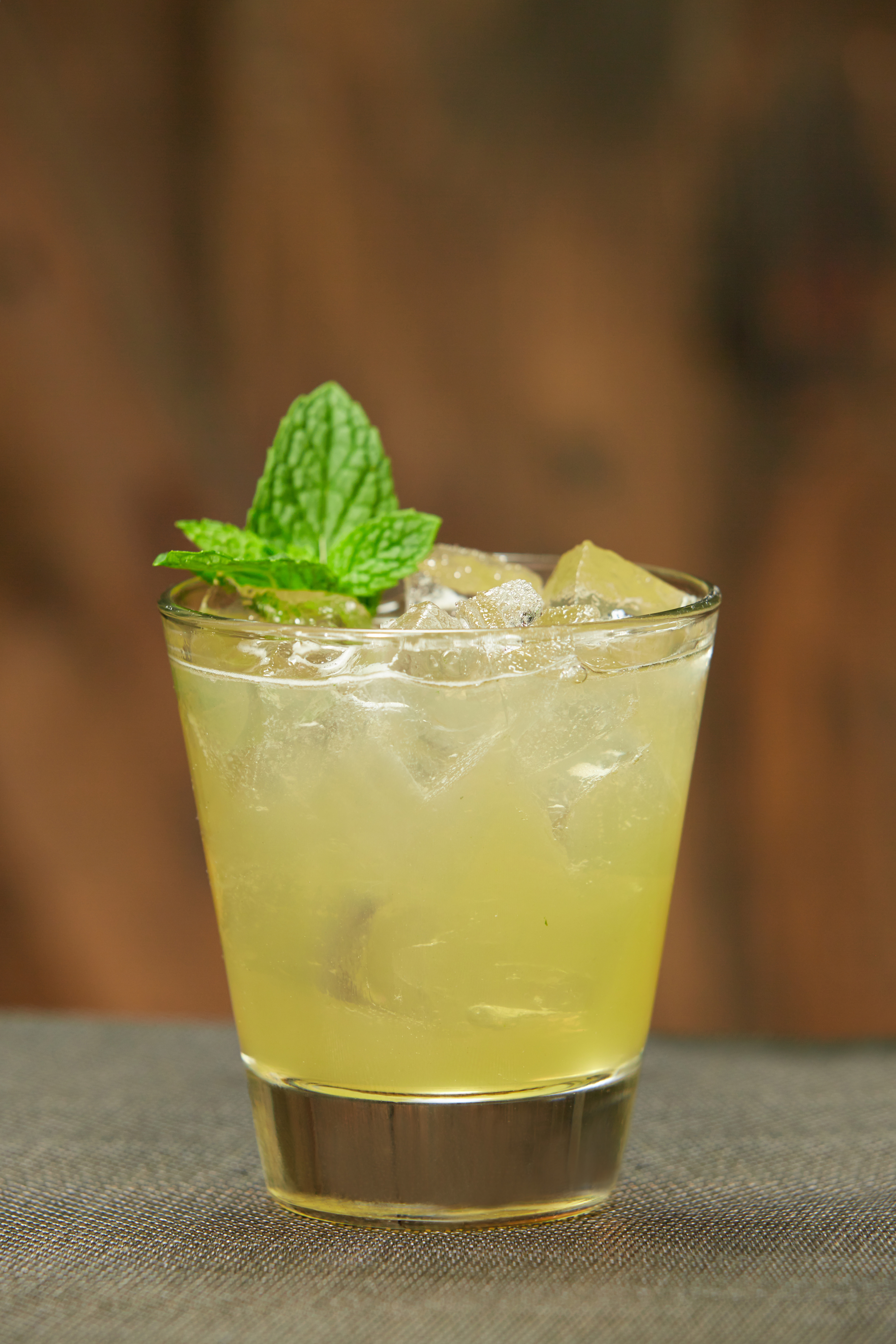Muddle mint leaves in a glass, combine remainder of ingredients in a shaker with ice, shake vigorously and strain into the glass over fresh ice. Garnish with a sprig of mint leaves.