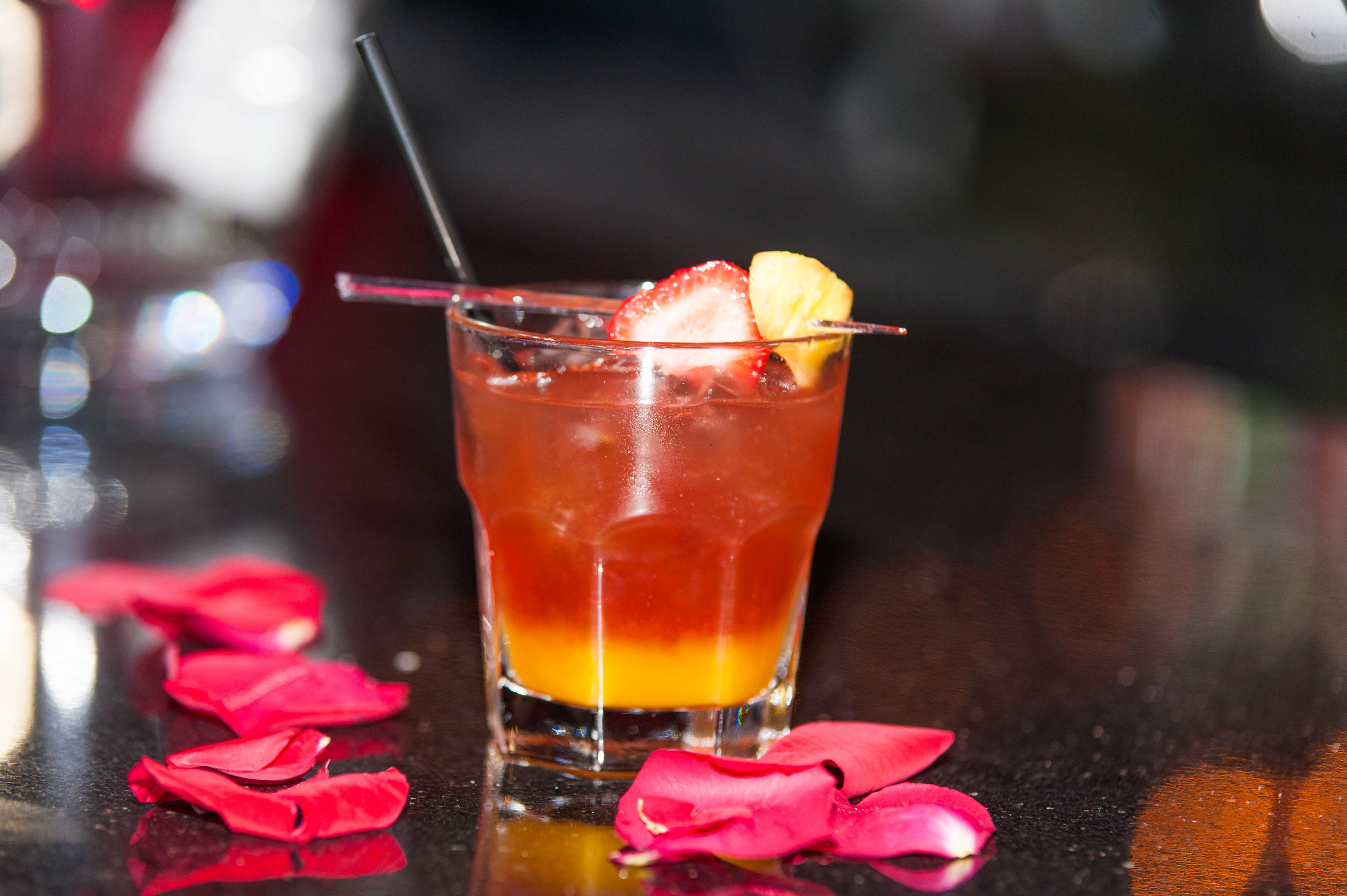 Garnish with a pineapple cube and a strawberry.