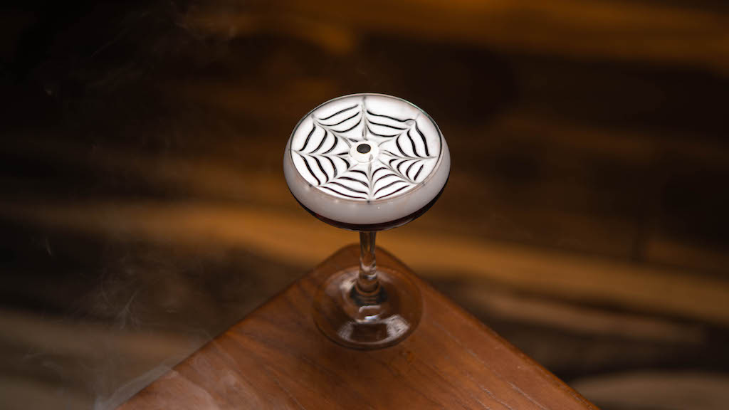 Combine ingredients in a cocktail stirring glass. Add ice and stir until ice begins to melt and cocktail is properly diluted. Strain into chilled coupe glass. Add heavy cream and cinnamon syrup to cocktail shaker. Shake (without ice) until cream turns light and airy. Float whipped cream on top of cocktail and garnish with a hand-drawn spider web and sugar eyeball.