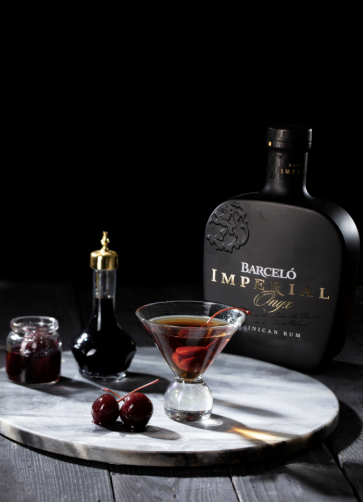 In a mixing glass with ice, combine Barceló Imperial Onyx, sweet vermouth and Angostura bitters. Stir until well-chilled and then pour into a chilled Manhattan or martini glass. Garnish with a maraschino cherry.