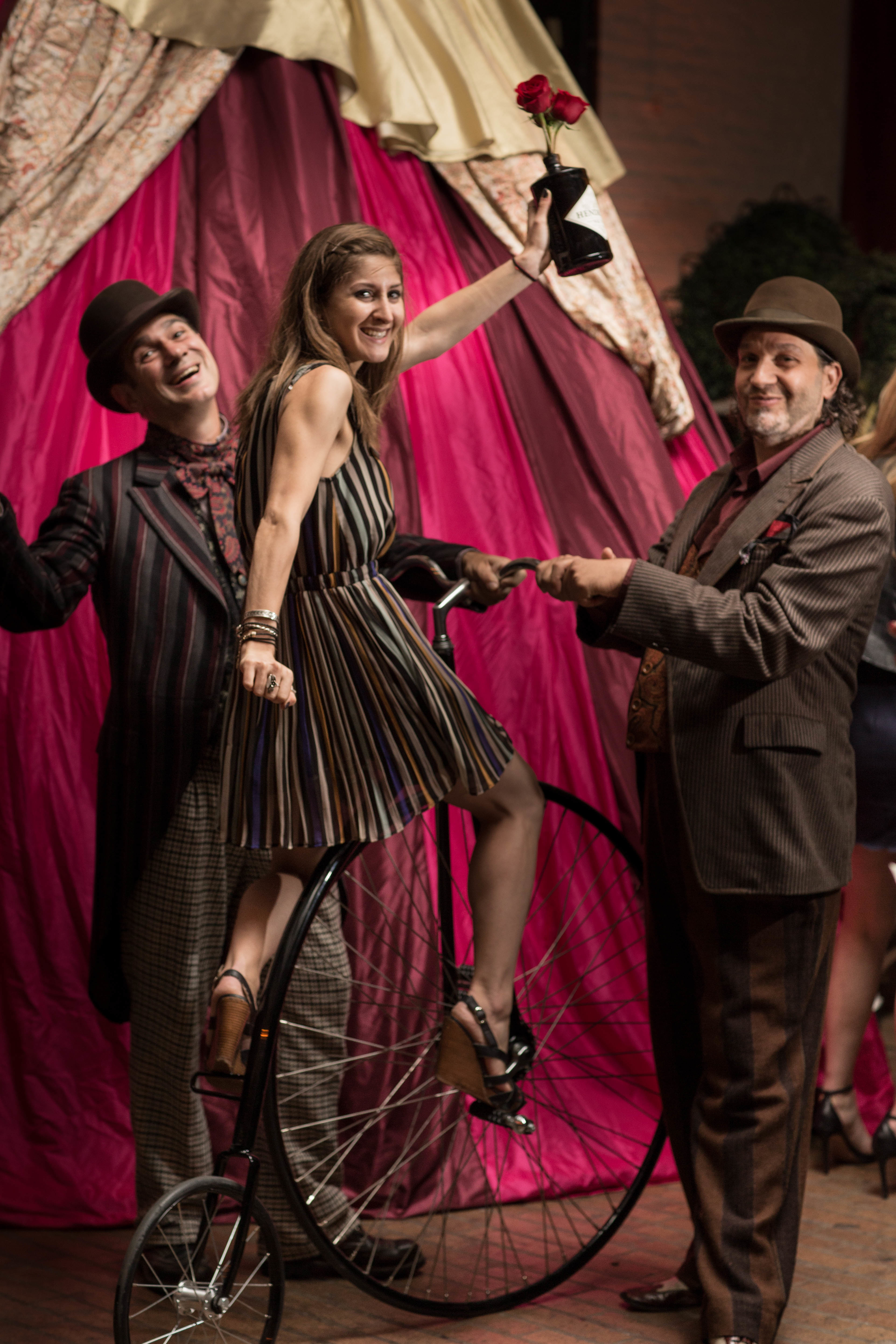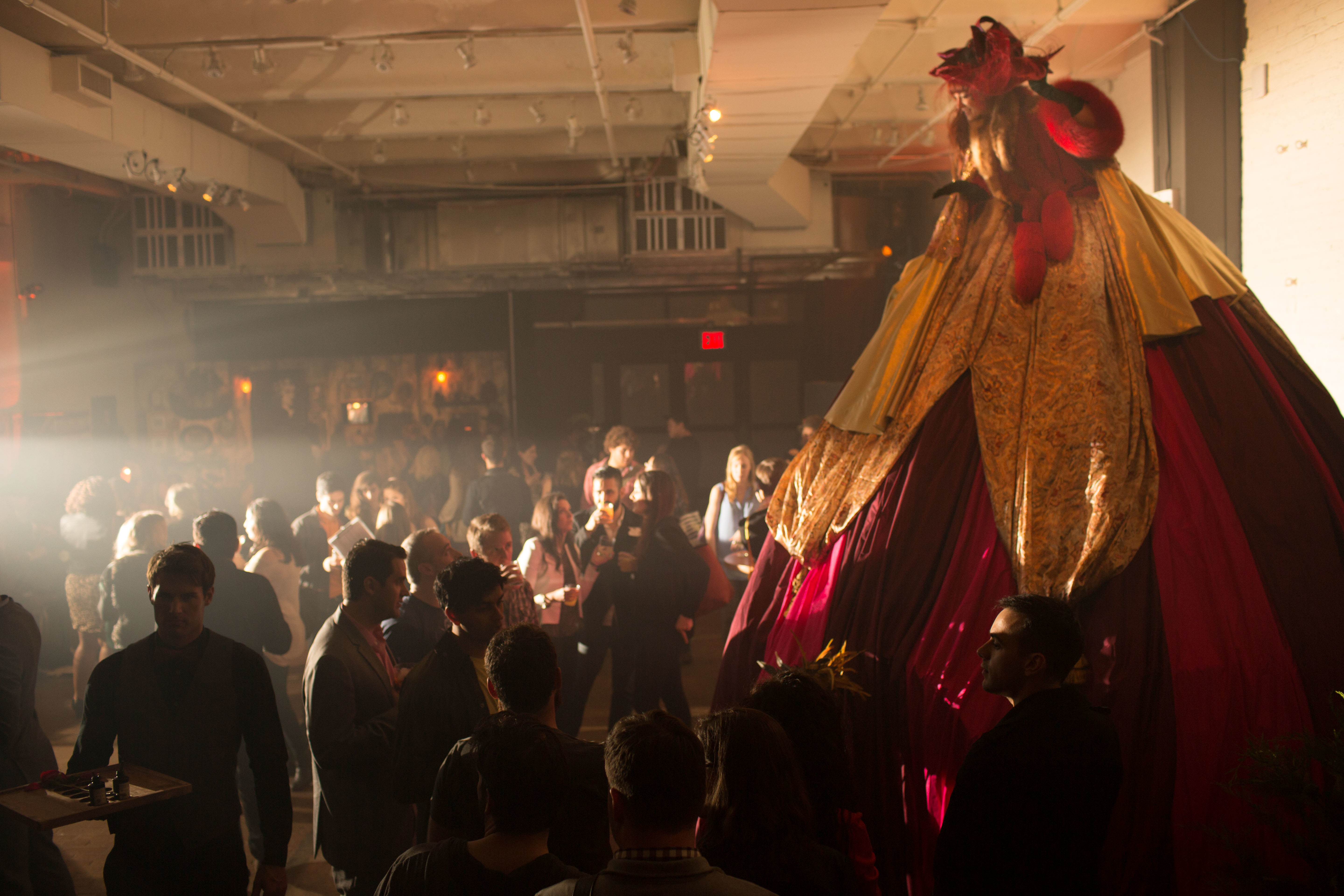 Inside you will have a hard time deciding where to look. Venture over to the gin well, where a juggler might just pour you some Traveling Emporium Punch, or try your luck at the bar where you can order up a glass of Benevolent Bog. Make sure to pay attention when acrobats take the stage (or in this case, middle of the room) for a gravity-defying performance of strength and flexibility. Passed hors d’oeuvres will keep you from feeling too dizzy, with tasty bites like lobster rolls, deviled eggs and more. If you were lucky enough, birdmen walking around would escort you under the skirt of a giant woman on stilts, to enjoy your own private boozy punch, but don’t expect to get too comfortable under there — you’ll just as quickly be shooed right back out.