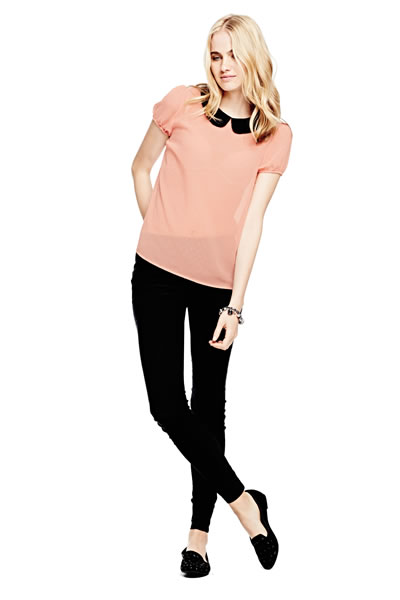 Princess Vera Wang, available at Kohl’s, retails for an extremely reasonable price point and has trendy holiday clothing. They offer festive garb for any fashionista, from shirts and sweaters to dresses and shoes. We love this simple peach blouse with a collared top – perfect for the holidays.