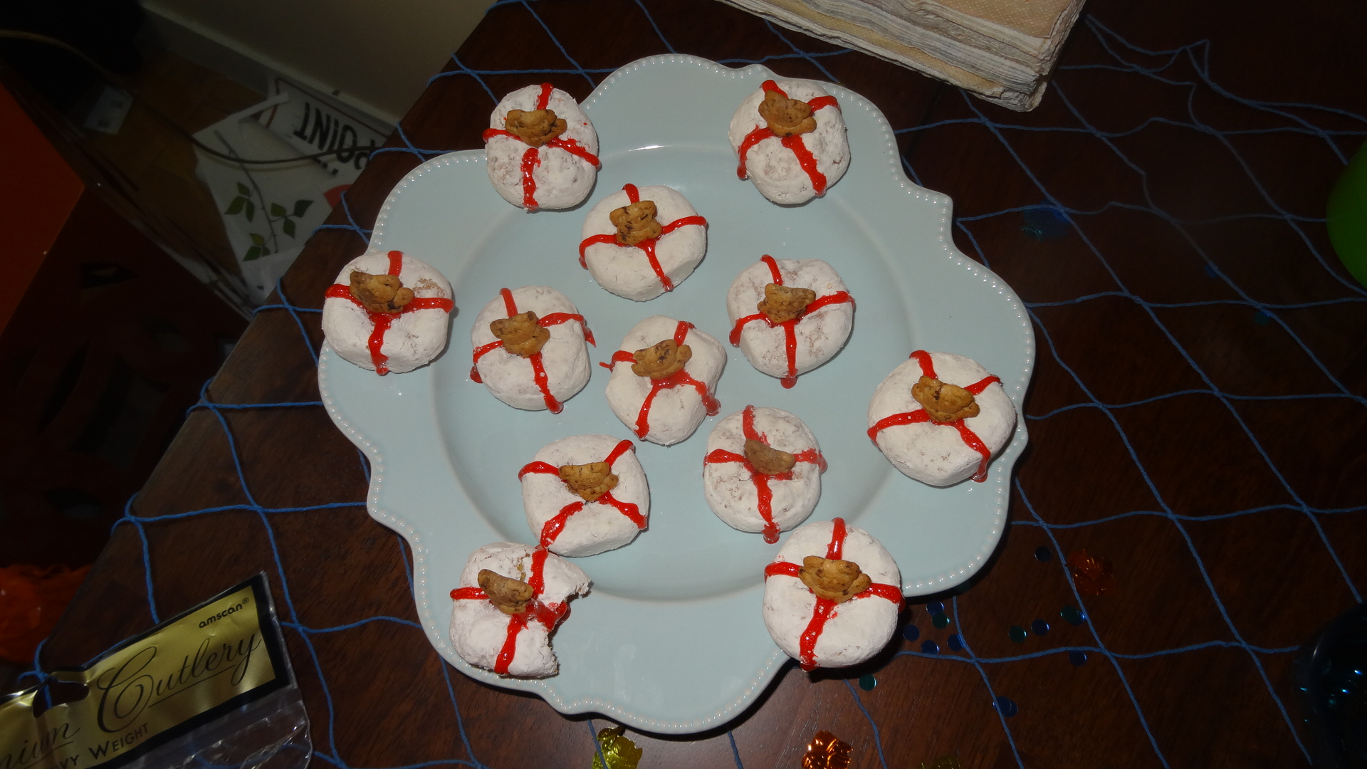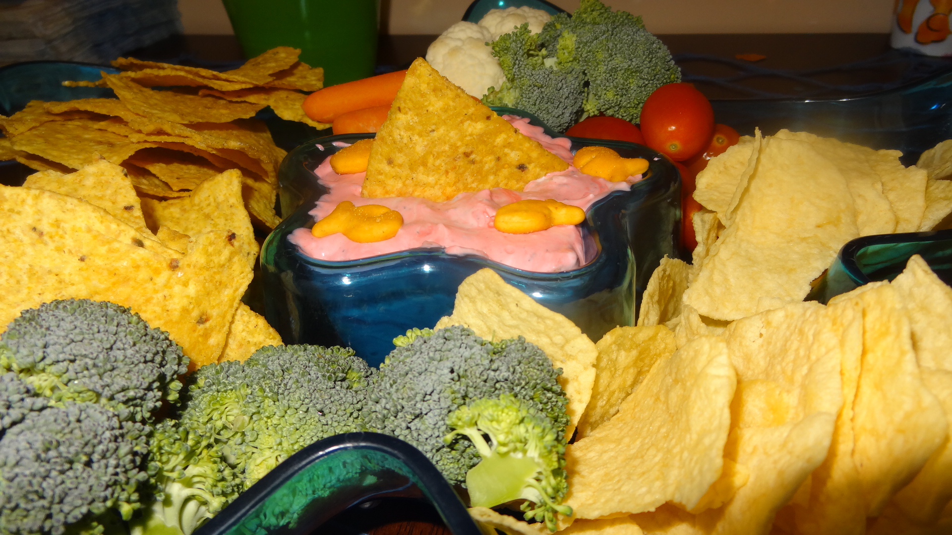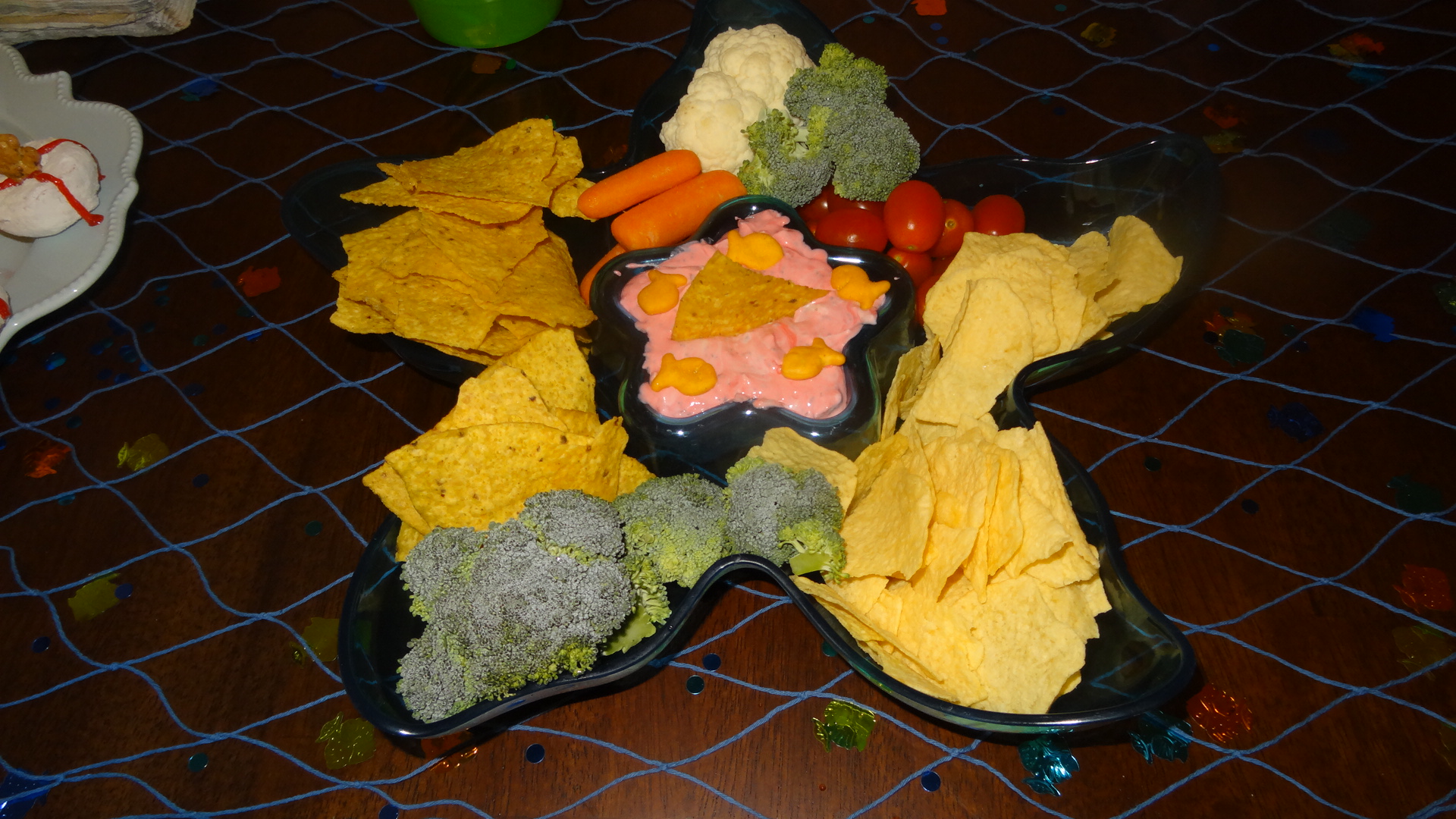Reel in your guests with some tasty shark bait! Everyone knows you can’t have a party without food and we all know sharks have some killer appetites. Stick with the theme and keep things simple. Finger foods are always best for parties. We started off with plenty of snacks, including GoldFish, Swedish Fish candies, and sand buckets full of chips. For an added touch, we added red food coloring to our dip to make it look like bloody water, and added some swimming fish and a shark fin on top. Bonus points for serving it in a themed dish (starfish!).