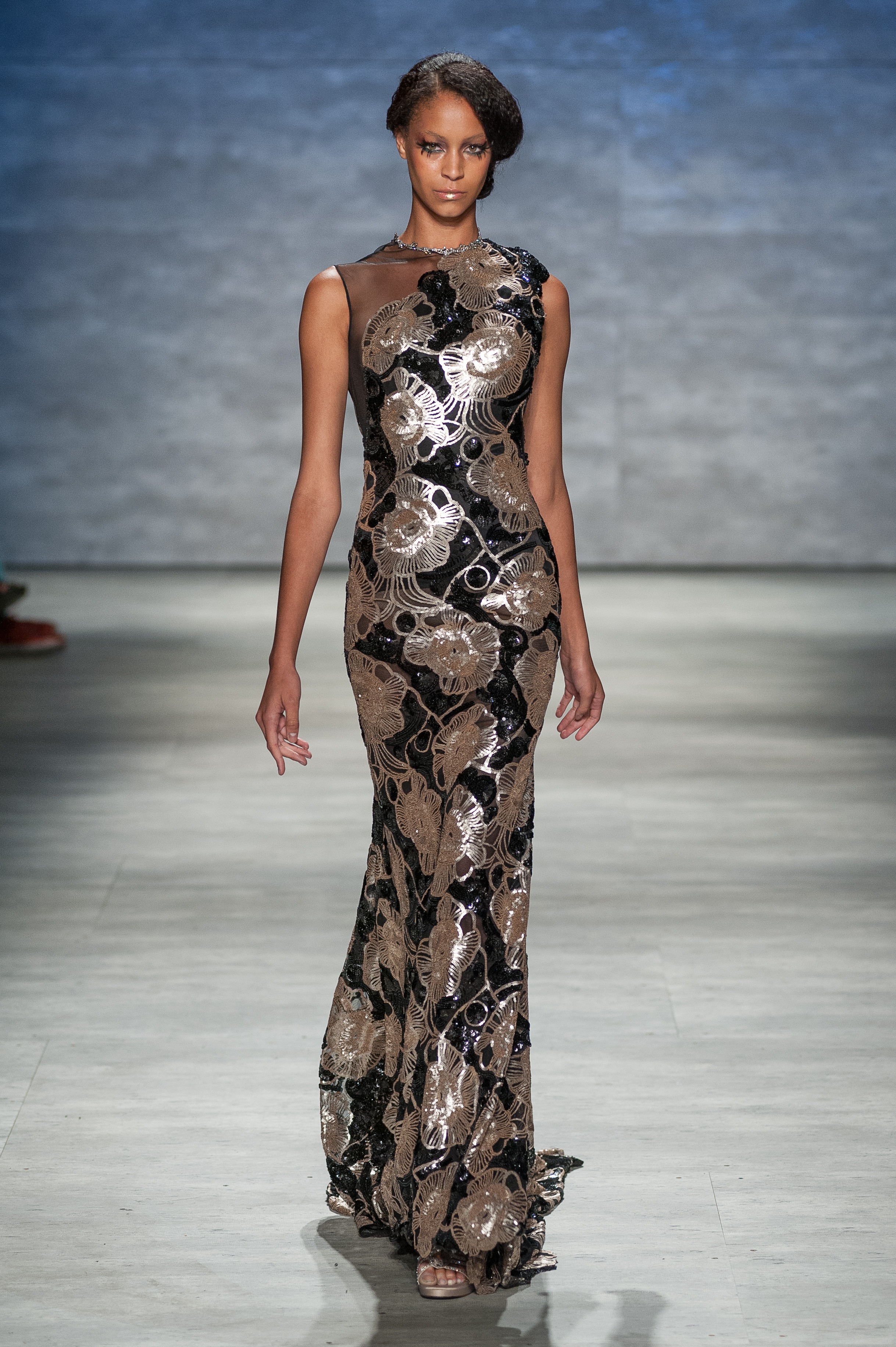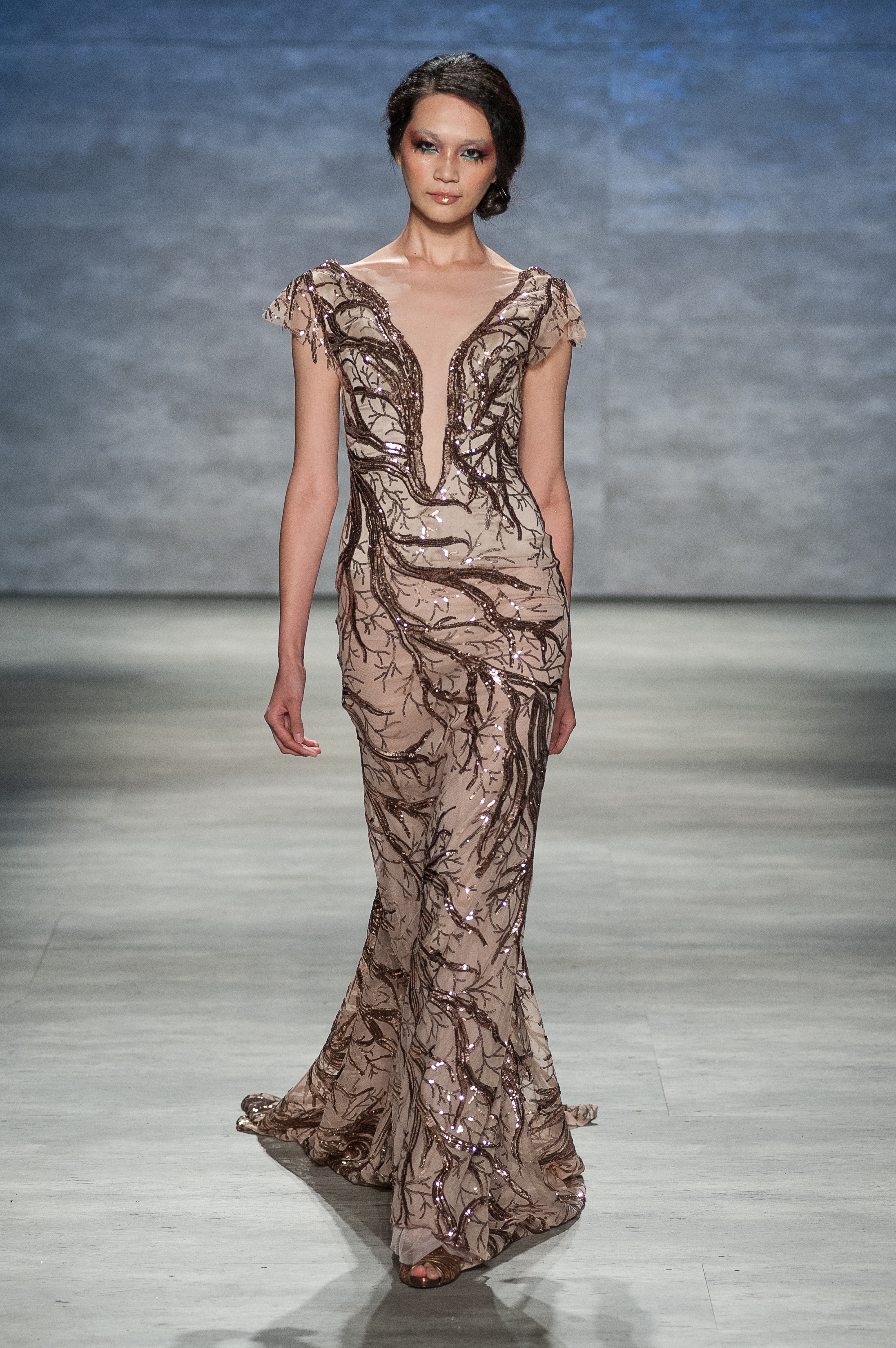 The show started off with a number nude colored gowns, and as the show continued, we see the palette change to blacks, silvers, gold and teal-colored gowns. This really allowed us to see the transformation of each dress since many of the dresses of the same color had similar qualities. One of my favorite gowns of the show was a teal, one shoulder gown with a long train. While this dress was more subdued than the other gowns that had her signature rock n’roll style, it was among one of the most glamorous pieces in the collection. The gold colored gowns, like the ones above, were are also some of my favorite because of the texture of the fabrics used. A lot of the detailing on the dresses, specifically the darker colored gowns, are used to create a tough exterior to showcase a subtle punk style. Seeing as how typical punk and elegant styles are so different from each other, you would think it would be hard to create a gown that is able to come off as glamorous evening wear and still have rock n’roll vibe. Kati Stern does it seamlessly.