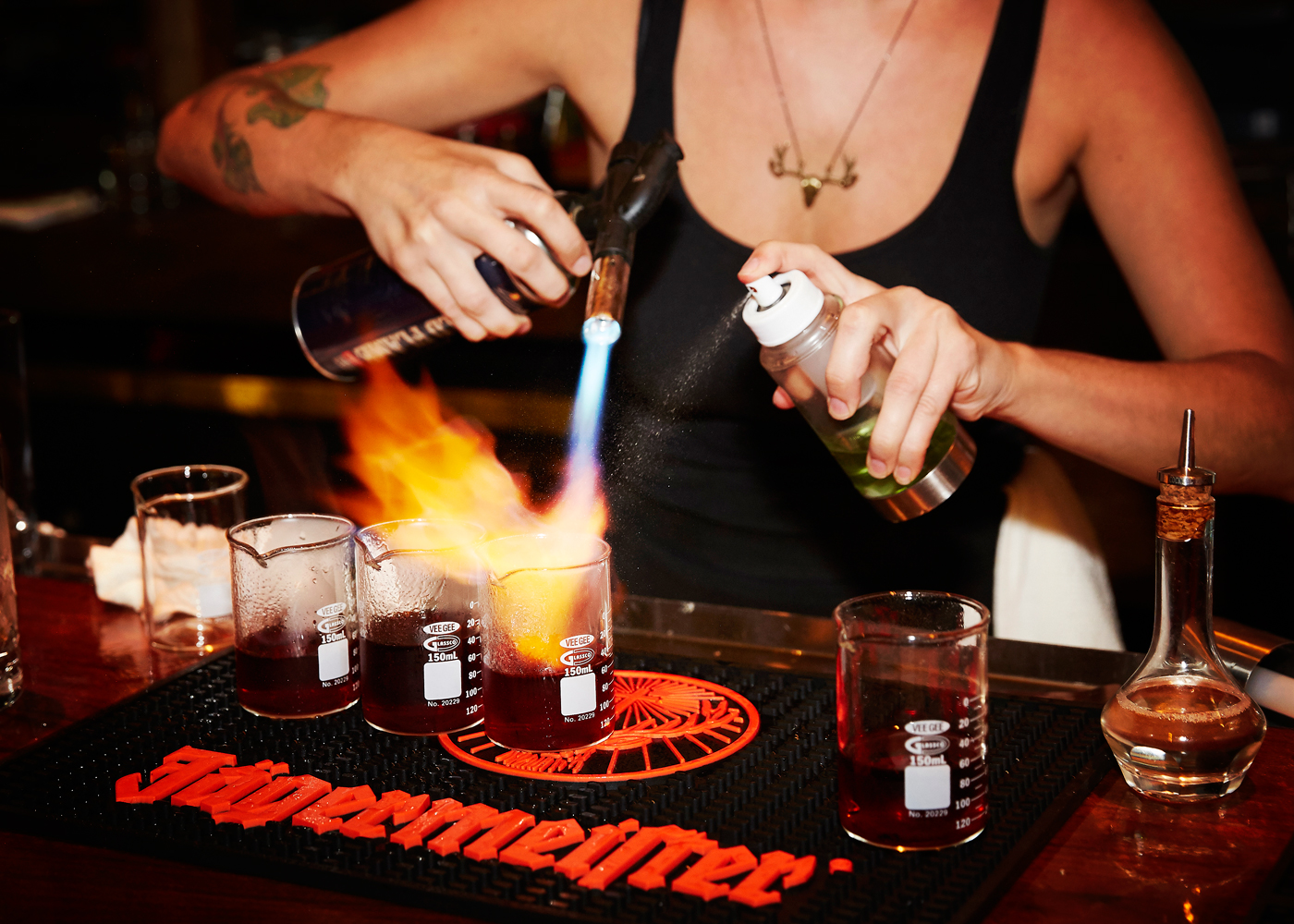 Stir together Jägermeister, Cocchi, and Aperol. Pour into test tube. Add 2-3 drops of Falernum from eye dropper. Using spray bottle of chartreuse and blow torch, light chartreuse on fire over beaker.