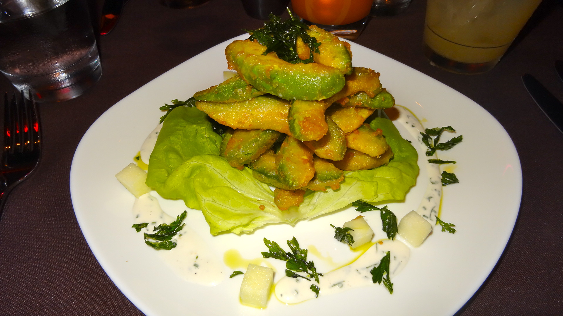 The food at Tender is as equally sophisticated as is the atmosphere. The restaurant offers Modern American cuisine, as well as sushi. Executive chef Dale Schnell and sushi chef Edwin Purnomo work together to produce an inventive and diverse menu of selections. To compliment the food, mixologist Isaac Grillo lends his expertise to the restaurant’s signature cocktail menu. From filet mignon, atlantic salmon and black cod butter lettuce to wild ginger edamame and omakase, Tender has offerings for every guest. Some hits from the menu include the avocado fries, which are exactly what they sound like and will make you one happy camper. They are served along with diced apple, basil essence, and ranch dip.