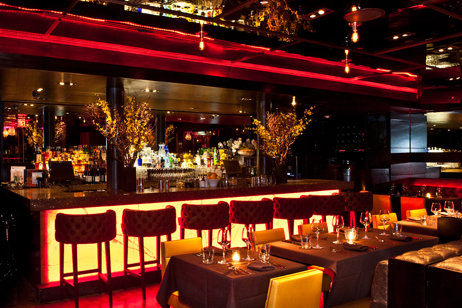 In addition to being a fabulous spot for travelers to shack up on their stay in New York City, the Sanctuary Hotel has also played host to a slew of glamorous events and enticed diners and imbibers to their Haven Rooftop Lounge. Now, the Sanctuary Hotel has expanded their draw by adding a new restaurant and lounge called Tender. Hoteliers Hank Freid and Brandon Freid have created a stunning space, welcoming guests first into the sleek lounge area, which is full of turquoise accents and patterned leather seats. Through the lounge you will find the restaurant, which has a unique reflective ceiling and dimmed red lighting. Additionally, there is a library room, complete with a collection of books, a fireplace and its own bar, perfect for private events.