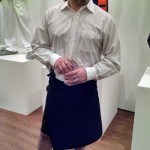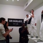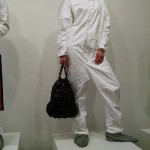 The accessories line from Iuri Shubladze was also very interesting to look at. The models were dressed in white Hazmat suits with gray Hazmat shoes, which I found to be very different from what I have seen this season so far. This really made the accessories stand out even more. The bags featured large tote bags in black with a stripe of color on each. While I didn’t care much about the tote bags, the bag that the model below was modeling really caught my eye because it looked so badass. The texture of the bag itself with the squares really made the whole thing work. The designer himself was very pleasant and was rocking an amazing outfit as can be seen below.