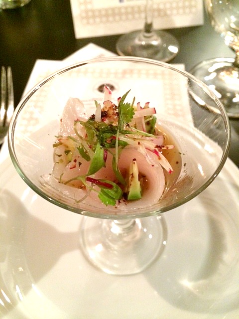 Next, we were treated to a lovely pairing dinner. First up was Hamachi Crudo with yuzu, cilantro and avocado, along with Oysters topped with sherry jardiniere. These two dishes were paired with the 2013 Spitfire Sauvignon Blanc, which was made with grapes harvested in early April from the Murphy Family Vineyard, located in the Rapaura subregion of Marlborough. Like any good white wine, this paired wonderfully with the Asian-influenced seafood that was presented at dinner. The wine had a long finish and had notes of grapefruit, along with tropical fruit aromas.