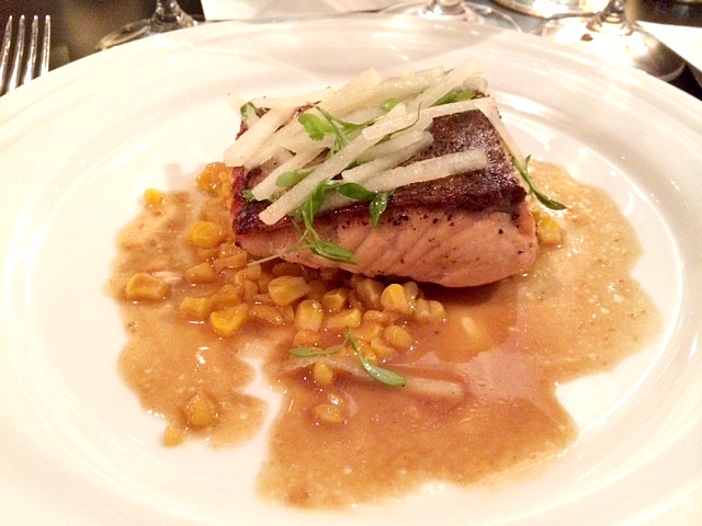 For the main course, we immensely enjoyed the Salmon, served with spiced corn, Asian pear, cilantro salad and miso reduction, which was paired with the 2013 Wild Grace Chardonnay. Another successful pairing, this wine is composed of harvests from two Hawke’s Bay vineyards — Corner 50 and Stathallan. This chardonnay is particularly minerally in taste, with a nutty finish and hints of citrus.