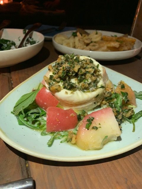 This appetizer made me question how at this point in life I’ve never had a smoked ball of creamy mozzarella, but alas, here we are. Walnut pesto and roasted honeycrisp apples complete the dish