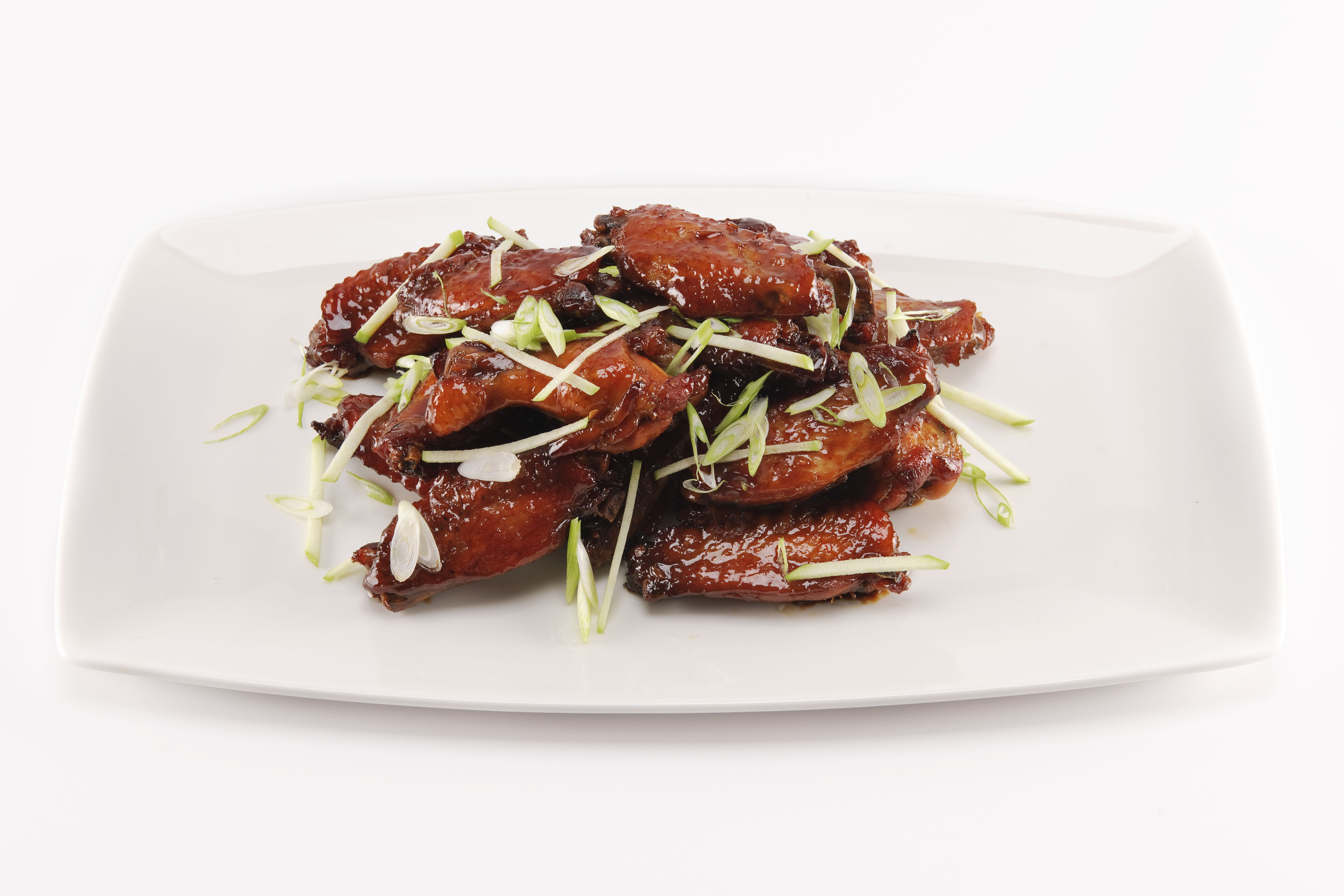 2. Preheat the oven to 325°F. Remove the wings from the pot and transfer to a parchment lined sheet tray. Bake for 15-20 minutes until the wings begin to color and the glaze becomes shiny. Garnish with minced scallions and apple. Serve immediately.