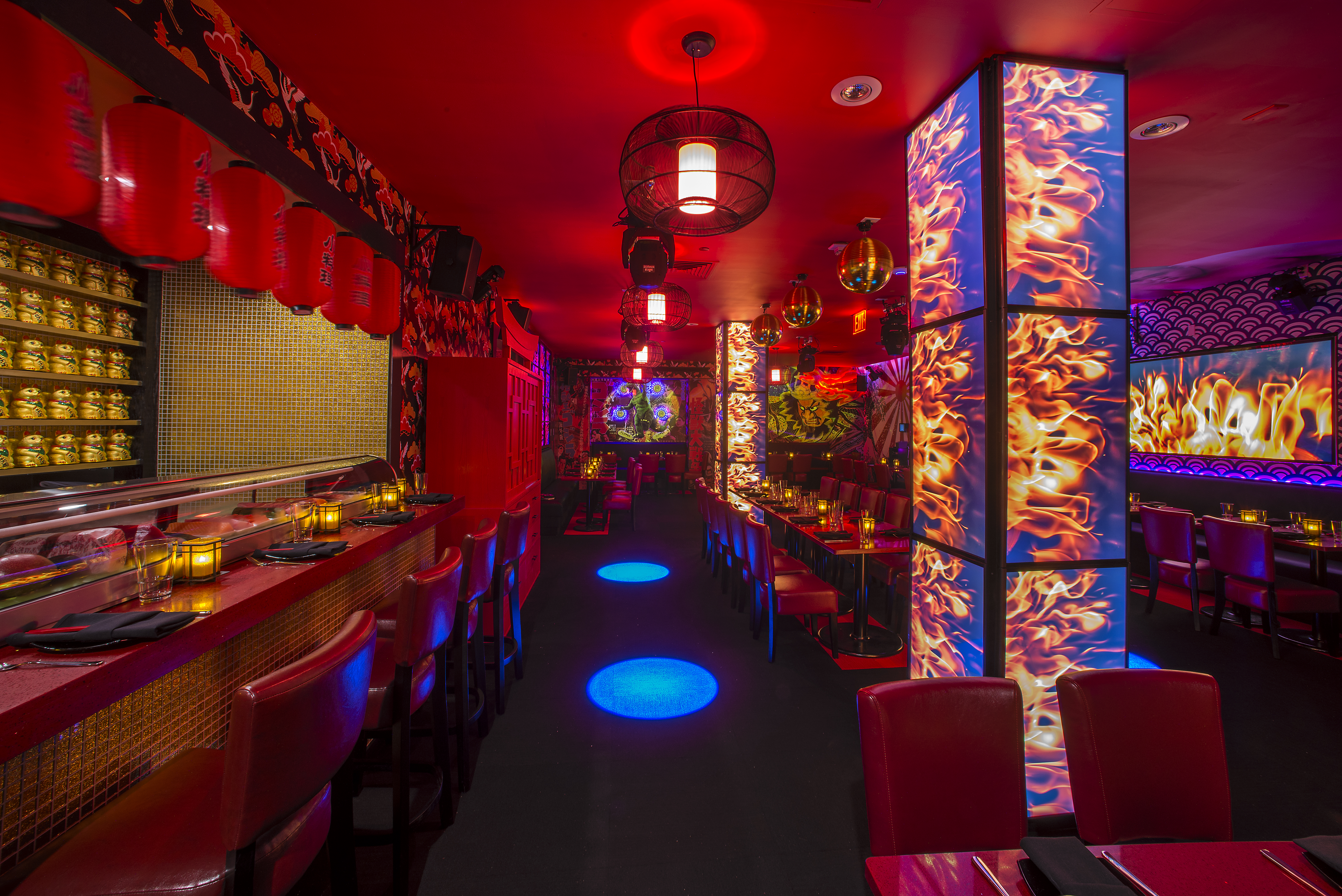 Located within The Tuscany Hotel, Sushi Roxx greets customers with a bar and lounge area, serving up hand-crafted cocktails. Once you enter into the dining room, you will be wowed with what greets you. The room could easily be described as Tokyo on acid (in a good way), with walls and columns that change from Asian cityscapes to roaring fires and psychedelic graphics, courtesy of the flatscreen video monitors hidden within. Make sure to take a good look around, because each way you turn there is something new to see — from the Maneki Neko Lucky Cats waving in sync behind the sushi bar to the sumo wrestlers looking down on you while you eat to the Godzilla taking over a city.