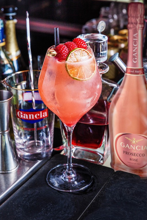 Add cubed ice to a wine glass, followed by the Grapefruit juice, lime juice and simple syrup. Top off with Gancia Prosecco Rosé D.O.C. Garnish with 3 raspberries and lime wheel. Enjoy!