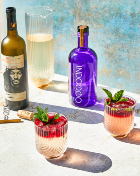 In a cocktail shaker, add simple syrup and strawberries, mint leaves, and cucumbers. Muddle together. Add Indoggo and ice and shake. Strain into a glass with ice. Top with ginger beer, leaving room at the top. Using the back of a spoon, slowly add wine to layer the cocktail. Garnish with fresh mint. Stir to incorporate before drinking.