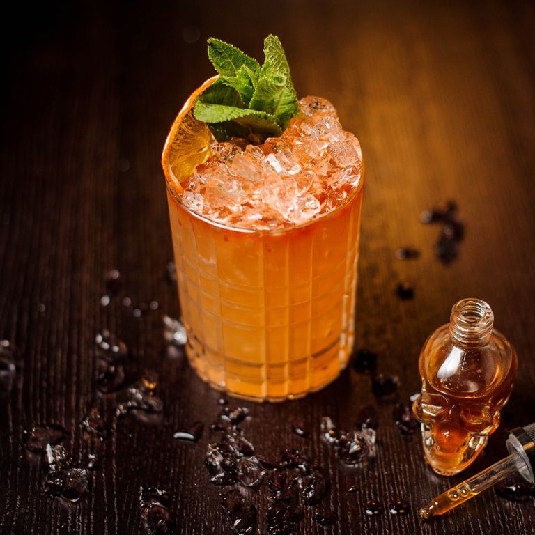 In a Collins glass, combine ice, tequila and orange juice. Don’t mix in the grenadine, and instead let it ooze from the top to give a more Halloween-themed effect. Garnish with one orange slice and a cherry.