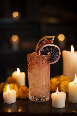 Combine all ingredients except for grapefruit beer into a cocktail shaker, shake thoroughly. Rim the Collins glass with Tajín, then add fresh rocks ice. Hawthorne and fine strain the cocktail over rocks in the glass, then top off the cocktail with grapefruit soda or grapefruit beer. Garnish with a dried blood orange wheel and a torched grapefruit half-moon.